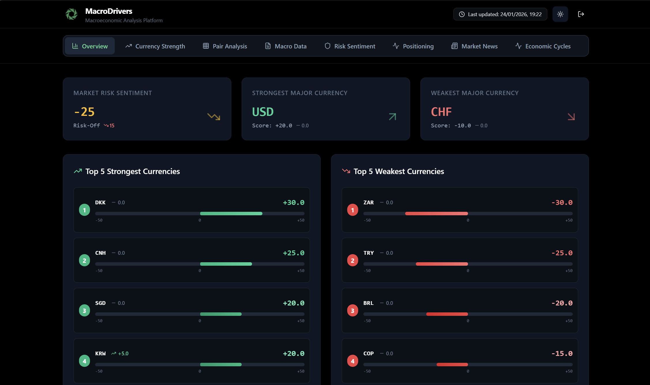 The Overview Tab is your starting point for quickly grasping the current market landscape. It presents a concise summary of critical market conditions, allowing you to gauge sentiment and identify significant currency movements at a glance.
