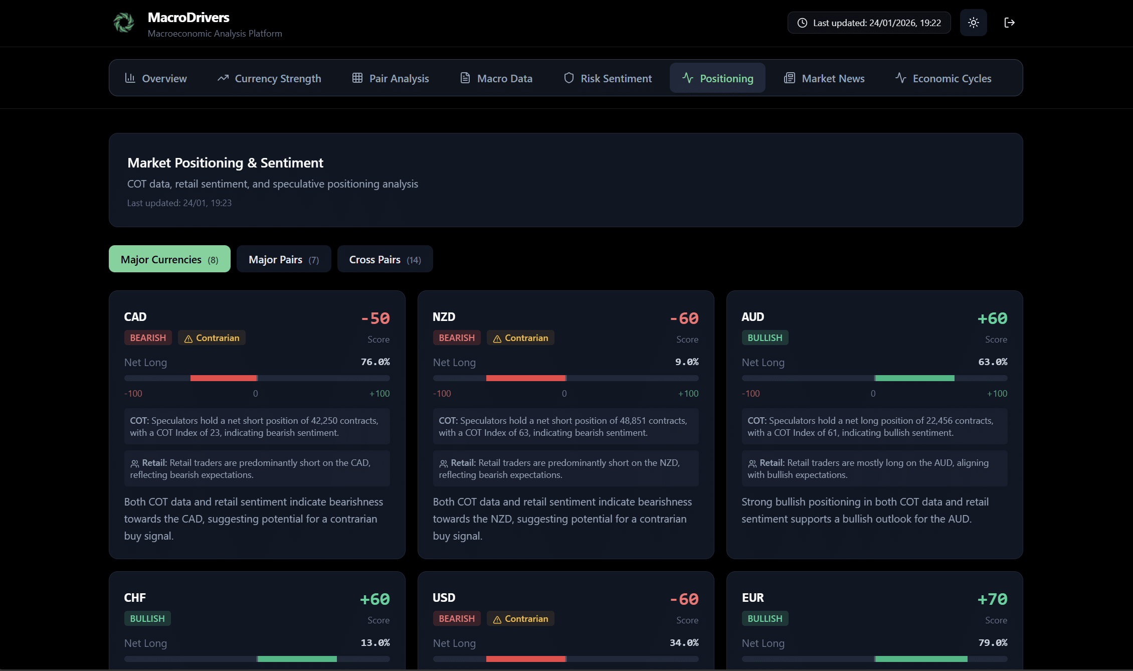The Sentiment Tab provides an in-depth look into market positioning and sentiment across various asset types (individual currencies, currency pairs, and crosses). Understanding sentiment can offer contrarian trading opportunities or confirm existing trends, as markets often overextend in one direction.