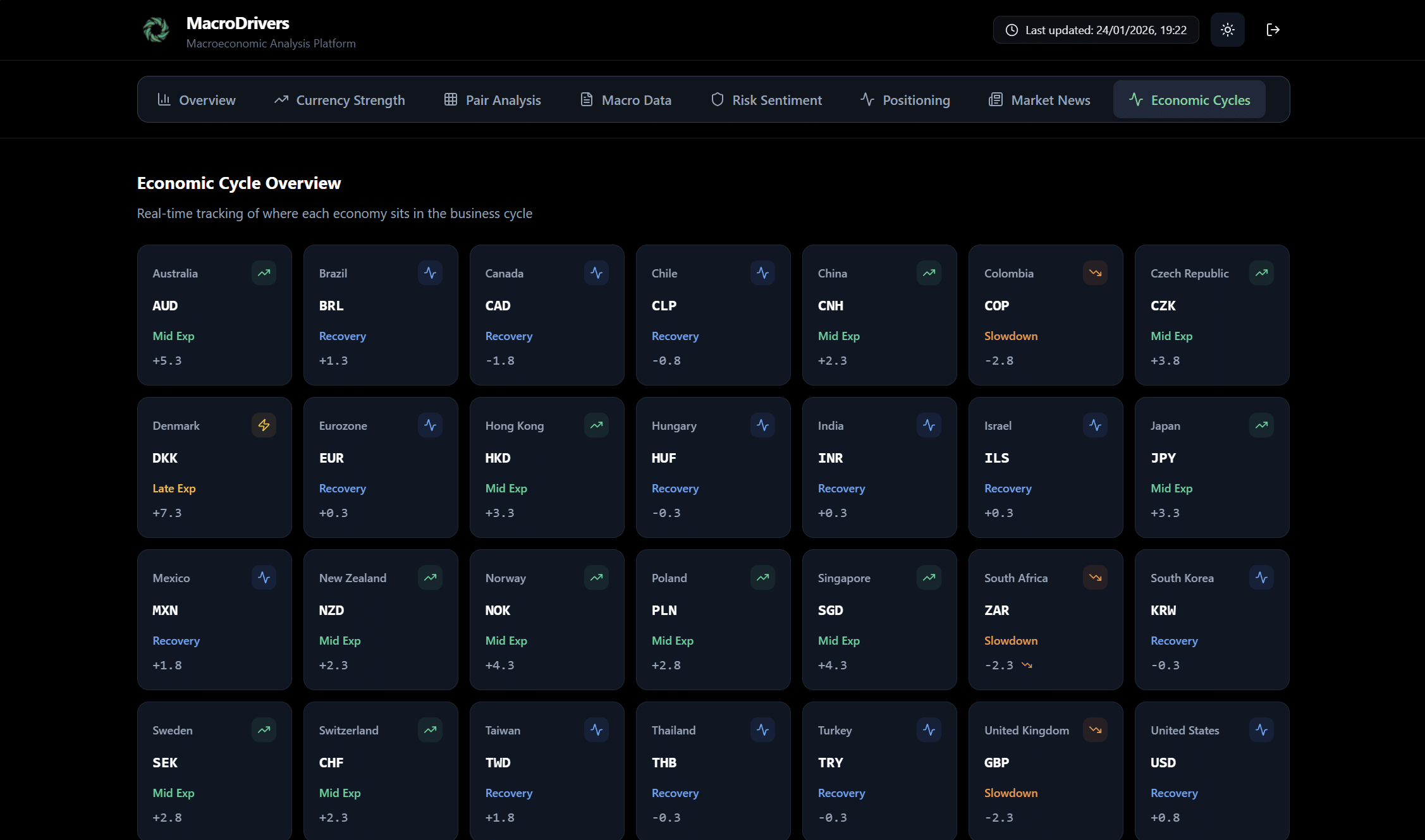 The Cycles Tab offers a unique perspective on the economic health of various countries by categorizing them into different phases of the economic cycle. Understanding where an economy is in its cycle can provide valuable insights into its currency’s potential performance and future policy decisions.
