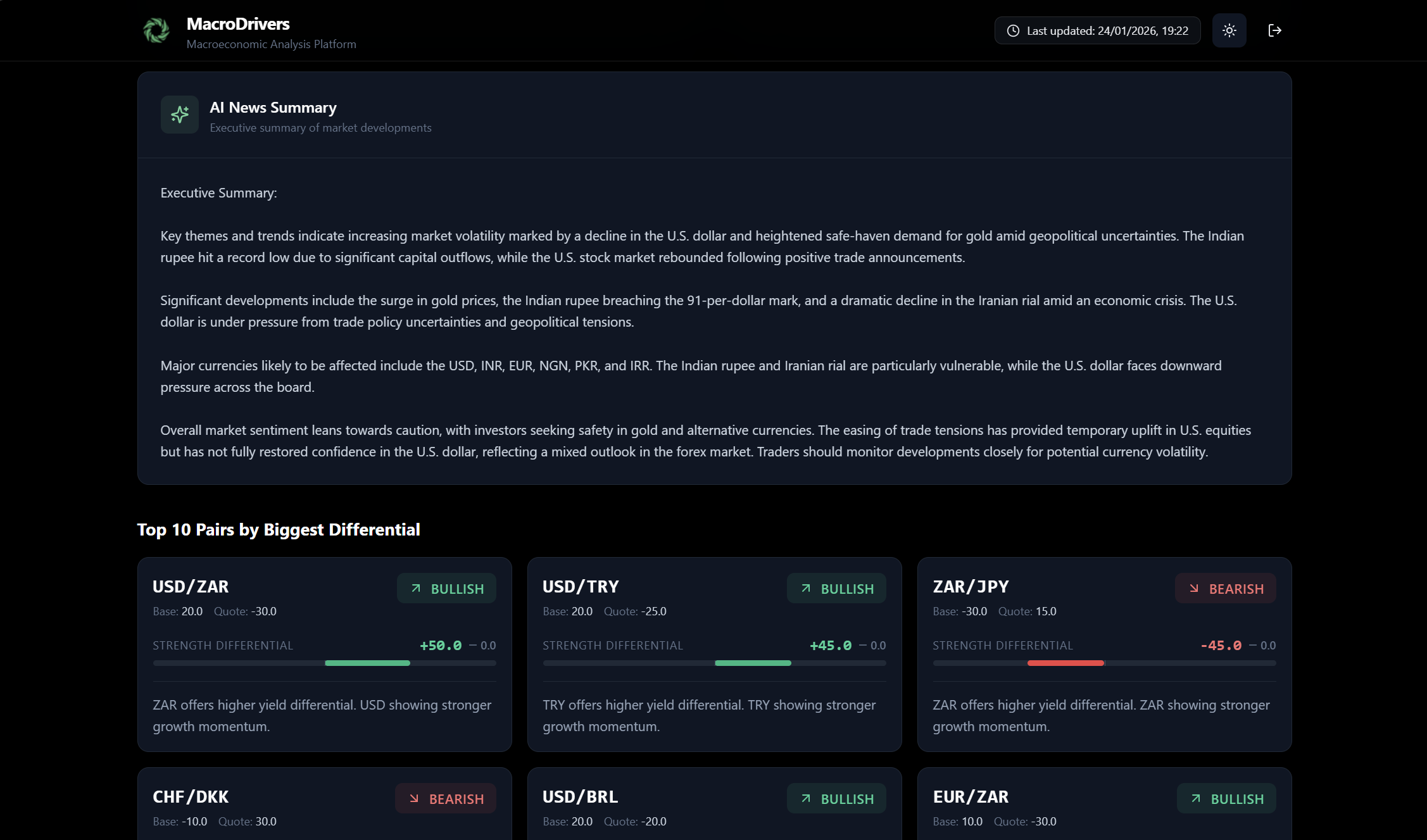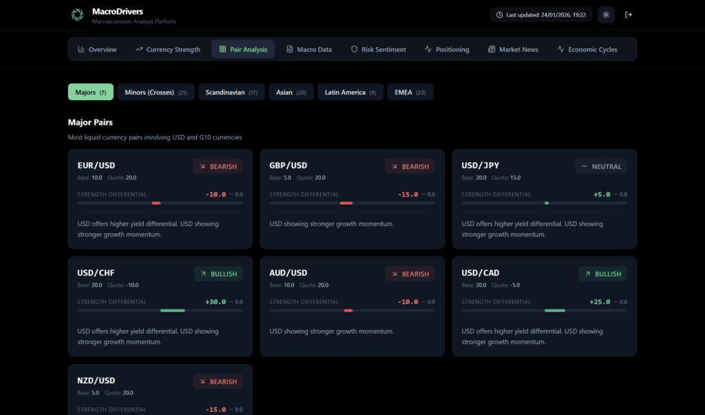 - Explanation: A short, AI-generated summary explaining the core macro reasons behind the observed bias (e.g., “Macro divergence of X points based on composite fundamentals”, “USD offers higher yield differential”).