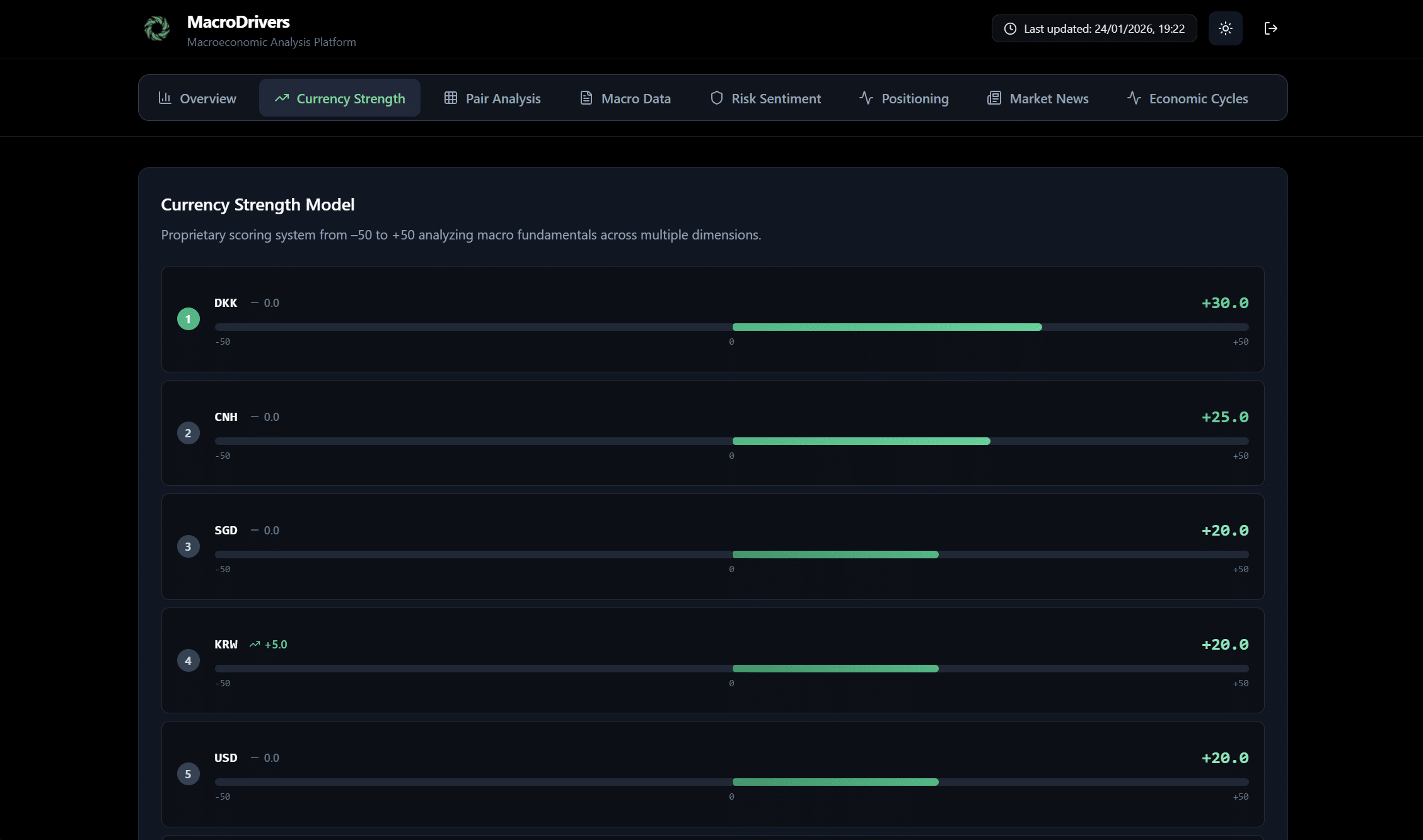 - Description: At the top, you’ll find a brief explanation of the proprietary scoring system, which assigns a score from –50 (extreme weakness) to +50 (extreme strength) by analyzing macroeconomic fundamentals across multiple dimensions.
