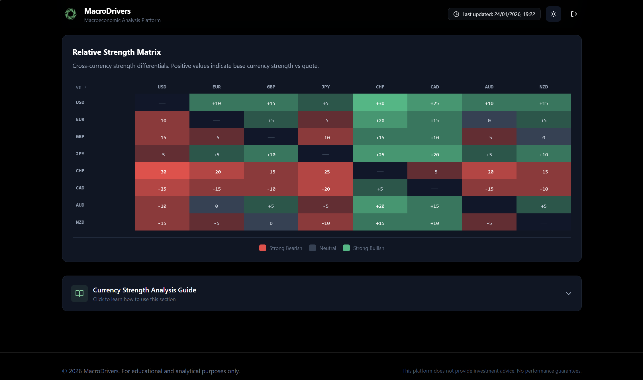 - Neutral: The fundamental strengths of the Base and Quote Currencies are relatively balanced, or the difference is not significant enough to warrant a strong bias.