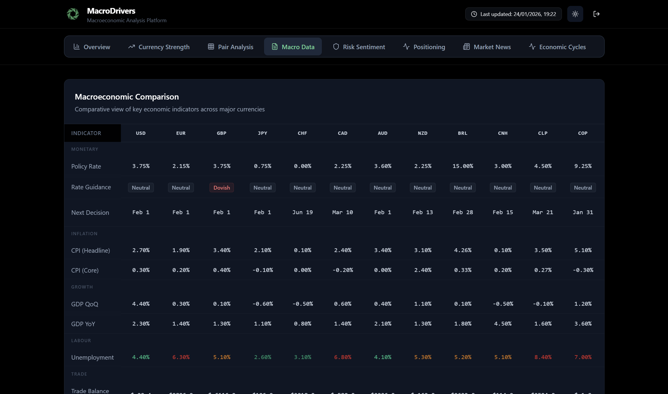 - Key Indicators: For each currency listed, key macroeconomic indicators relevant to its cycle position are displayed. These might include: