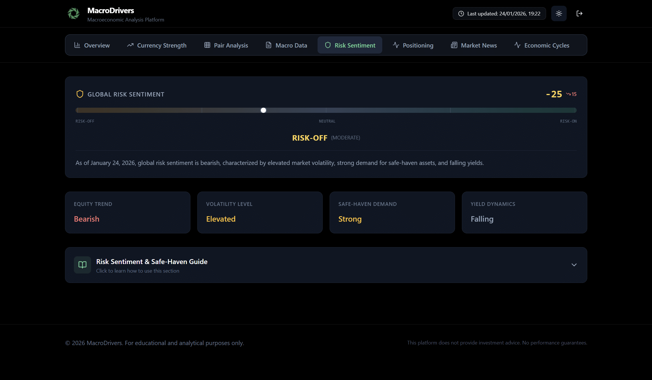 - How to Use: These panels help you understand the underlying drivers of the overall risk score. For instance, a “Risk-Off” score might be accompanied by a “Bearish” equity trend, “High” volatility, and “Strong” safe-haven demand. Analyzing these components together provides a more complete picture of market psychology.